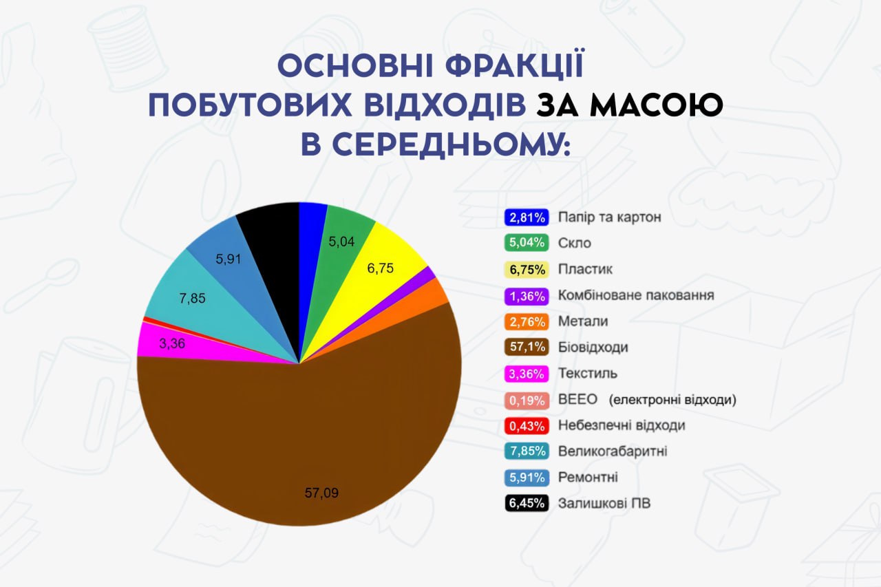 Біовідходи – 57,1% маси. Тобто більше половини того, що ми викидаємо, — органіка (харчові залишки, трава, листя тощо). Якщо місто не працює з біовідходами, воно фактично не працює з найбільшою частиною проблеми.